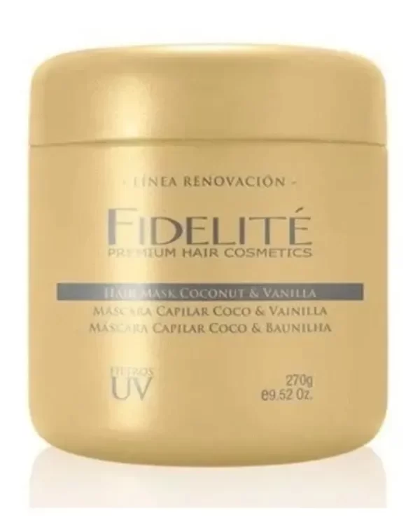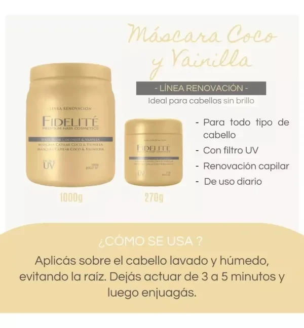- El baño de crema Coco & Vainilla - Fidelite es una excelente mascara capilar que promueve la renovacion y restauracion capilar brindando una excelente nutricion, sedosidad y brillo al cabello. Posee filtros UV cuidando de los rayos solares del dia a dia. Anti Frizz.